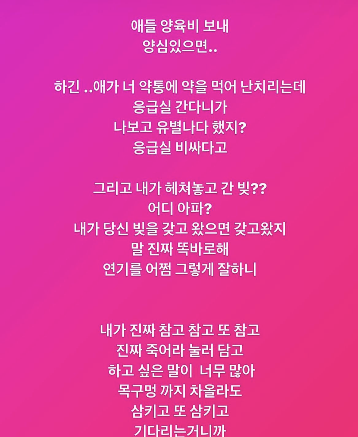 지연아 씨는 또한 "양육비를 내가 달라고 해야지 주는 것이니"라며 법적인 절차로만 이 문제를 해결하려 했다고 전했습니다.