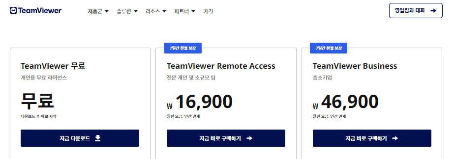 - 팀뷰어 공식 홈페이지(바로가기)에 접속합니다.