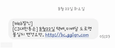 택배스미싱문자 링크도 이제 8월 22일이 다가오니 곧 있음 대량 폭탄으로 발송할 예정일까요?