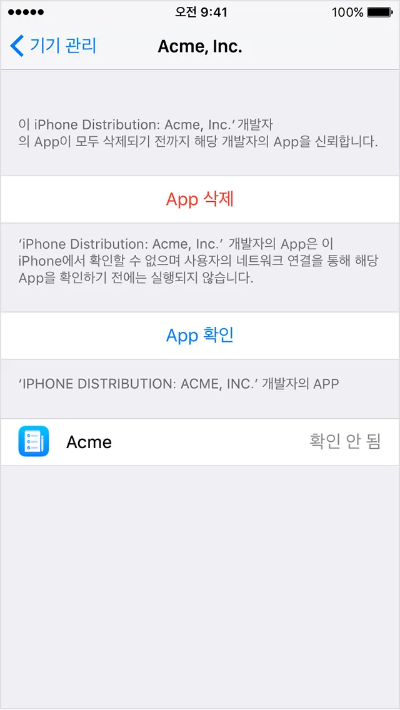 - '확인 안 됨' 메시지 해결: 인터넷에 연결되어 있지 않으면, 앱을 신뢰할 때 '확인 안 됨' 메시지가 나타날 수 있습니다. 이 경우, 인터넷에 연결한 후 '앱 확인' 버튼을 탭 합니다.