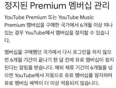 구글은 해당 국가에서 6개월 이상 접속하지 않을 경우 유튜브 멤버십을 취소하는 정책을 시행 중입니다. 이는 사용자들이 실제 거주 국가에서 유튜브 프리미엄을 이용하도록 유도하기 위한 조치입니다. 따라서, 해외 계정을 통해 유튜브 프리미엄을 이용하려는 시도는 장기적으로 불가능할 수 있습니다. 그렇기 때문에 우회방법을 사용하실 분들은 기존에 사용하는 구글 계정 이외에 새로운 구글계정을 만들어서 사용하시는 것이 안전합니다.