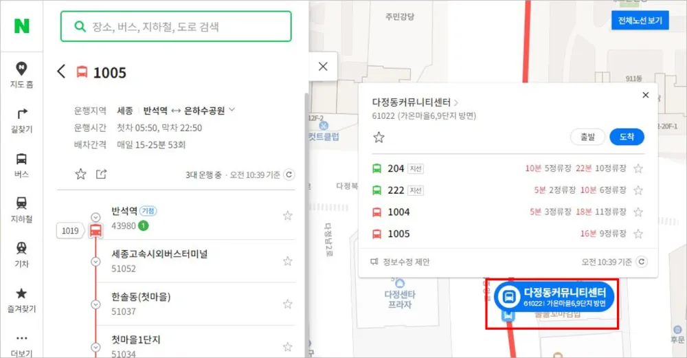 - 버스 번호 입력: 지도 검색창에 버스 번호를 입력합니다. 예를 들어, 1005번 버스를 확인하려면 "1005" 또는 "1005번"으로 검색합니다.