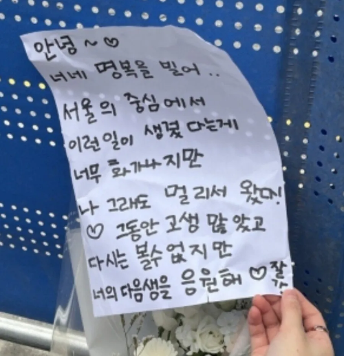 지난 3일 오전 6시 30분경 발생한 시청역 역주행 사고로 9명이 숨진 가운데, 추모 현장에서 ‘너의 다음 생을 응원해♡’라는 문구가 담긴 쪽지를 남긴 여성이 특정되었습니다. 해당 여성은 본지 기자에게 자신을 사고 희생자 중 2명의 13년 지기 고교 동창이라 소개했으나, 이는 사실이 아닌 것으로 확인되었습니다.
