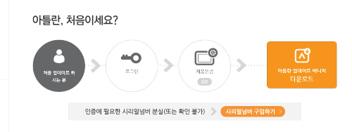 아틀란 홈페이지에 로그인하고, 시리얼넘버를 입력하여 제품 인증을 완료합니다. 업데이트 매니저에서 '지도 업데이트 시작' 버튼을 눌러 업데이트를 진행합니다.
