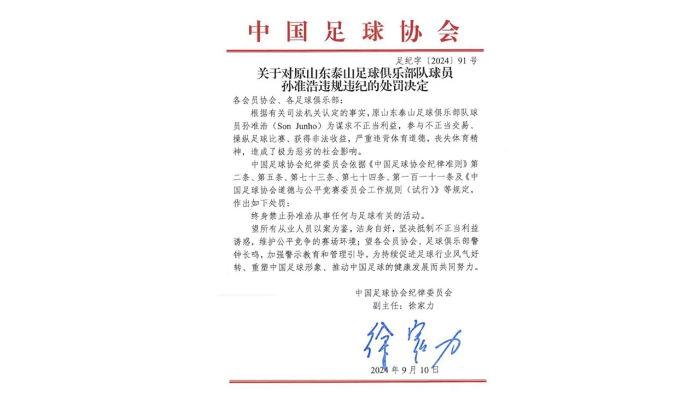중국축구협회는 "사법기관이 인정한 사실에 따르면 전(前) 산둥 타이산 선수 손준호는 정당하지 않은 이익을 도모하려고 정당하지 않은 거래에 참여, 축구 경기를 조작하고 불법 이익을 얻었다"며 손준호의 축구 관련 활동을 평생 금지한다고 발표했습니다.
