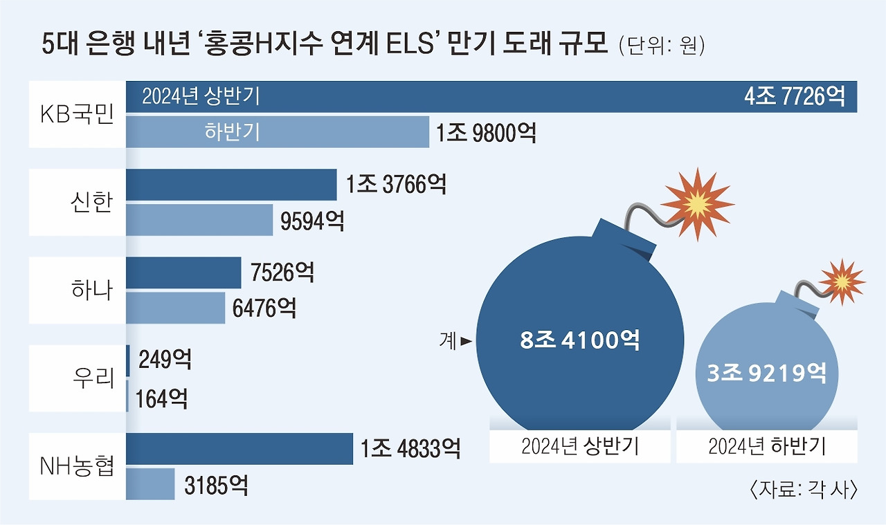 금융 투자를 할 때는 반드시 상품에 대해 충분히 이해하고, 모든 정보를 꼼꼼히 확인하는 것이 중요해요. 그래야만 나중에 불필요한 분쟁을 피할 수 있으니까요. 위의 사진은 국내 5대 은행(KB국민·신한·하나·우리·NH농협)에서 내년 상반기 만기가 다가오는 H지수 연계 ELS는 8조 4100억 원에 이릅니다. ELS는 개별 주식·지수가 일정 구간 안에 머무르면 일정 수익을 지급하는 파생상품입니다. 홍콩시장의 성과가 지금처럼 유지된다면 상반기에만 3조 원 이상의 손실이 발생할 수 있는 것입니다.