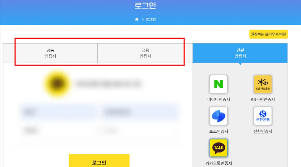 - 공동인증서(구 공인인증서) 또는 금융 인증서 로그인을 진행합니다. 간편 인증서는 신청이 되지 않을 수도 있으니 이점 확인하시길 바랍니다.